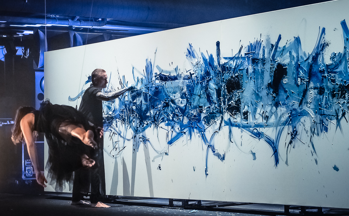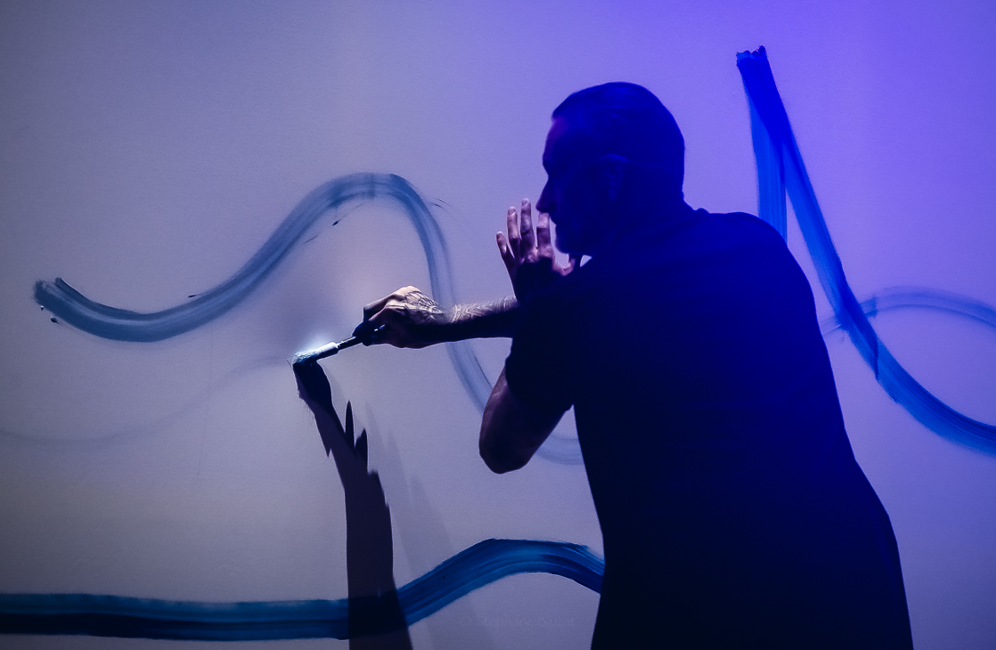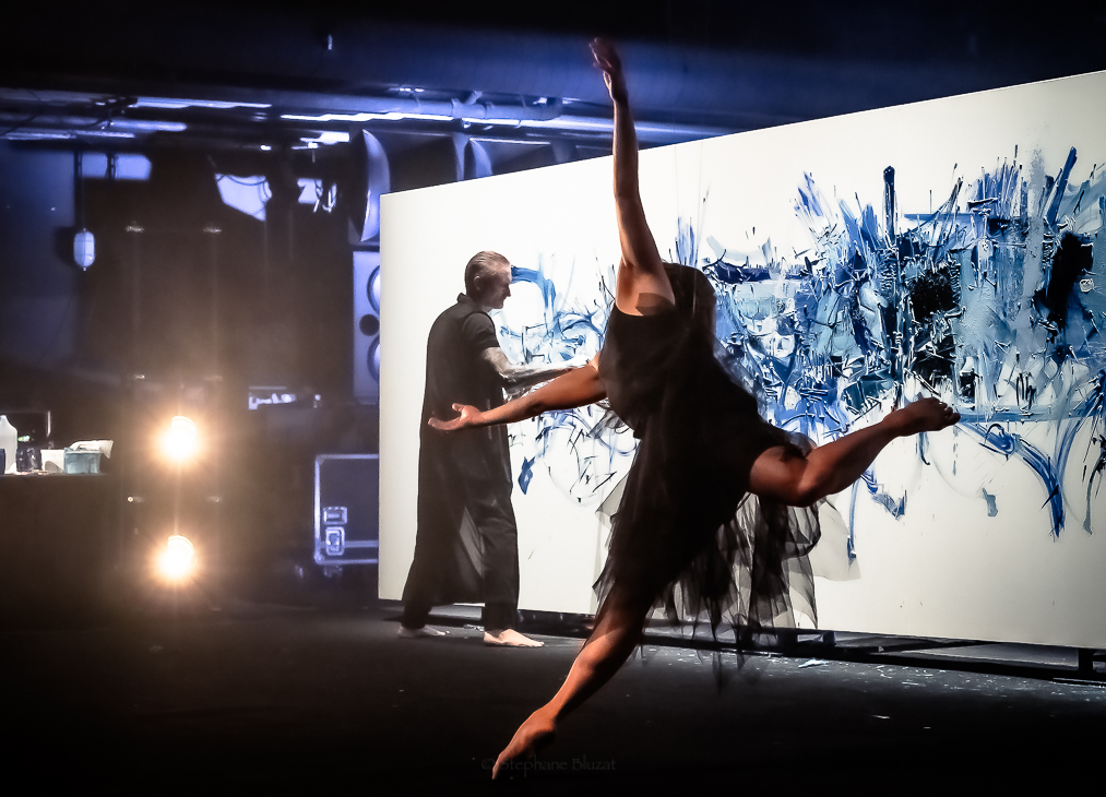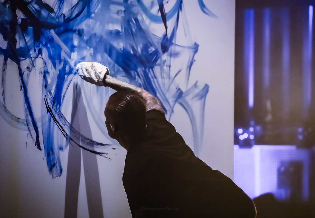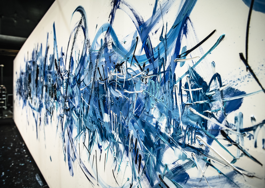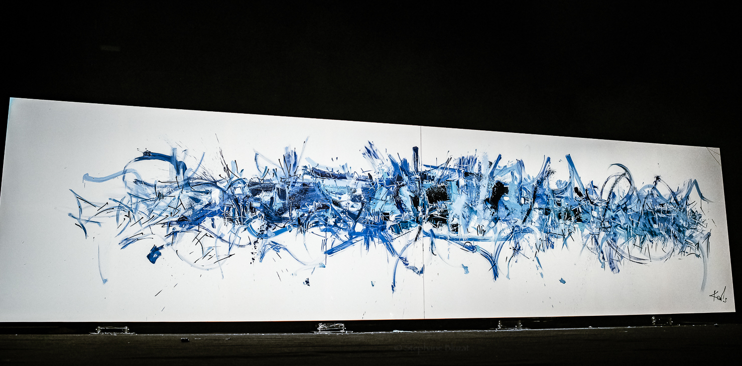 Lors de cette performance, l’artiste Karls, accompagné de Cybille Soulier (danseuse chorégraphiée en temps réel ) et de Sébastien Berteau (musicien composant en direct) a réalisé une toile de 8 x 2 mètres : « LA PROMESSE DU BLEU ».