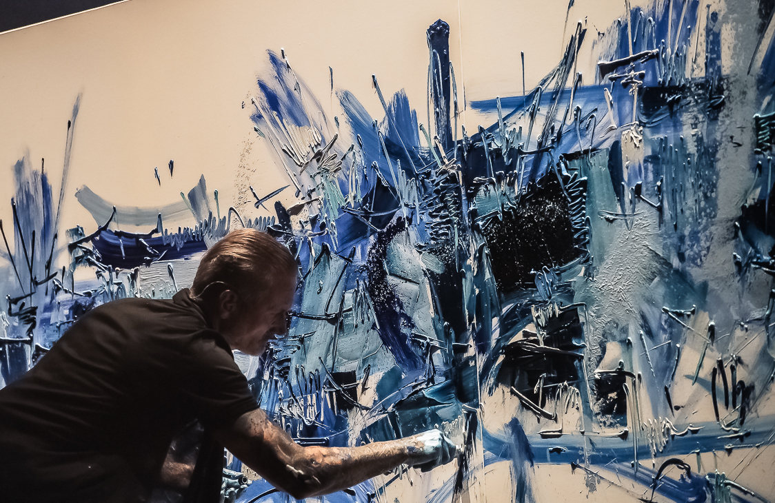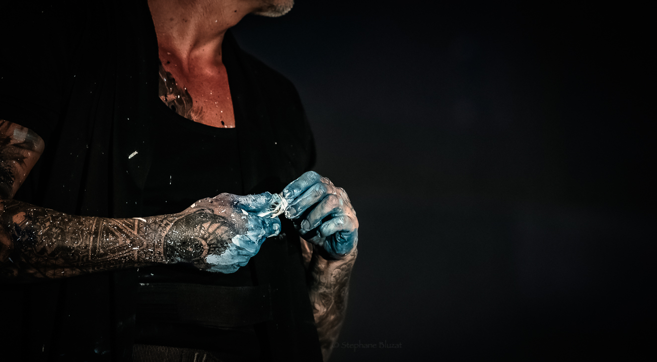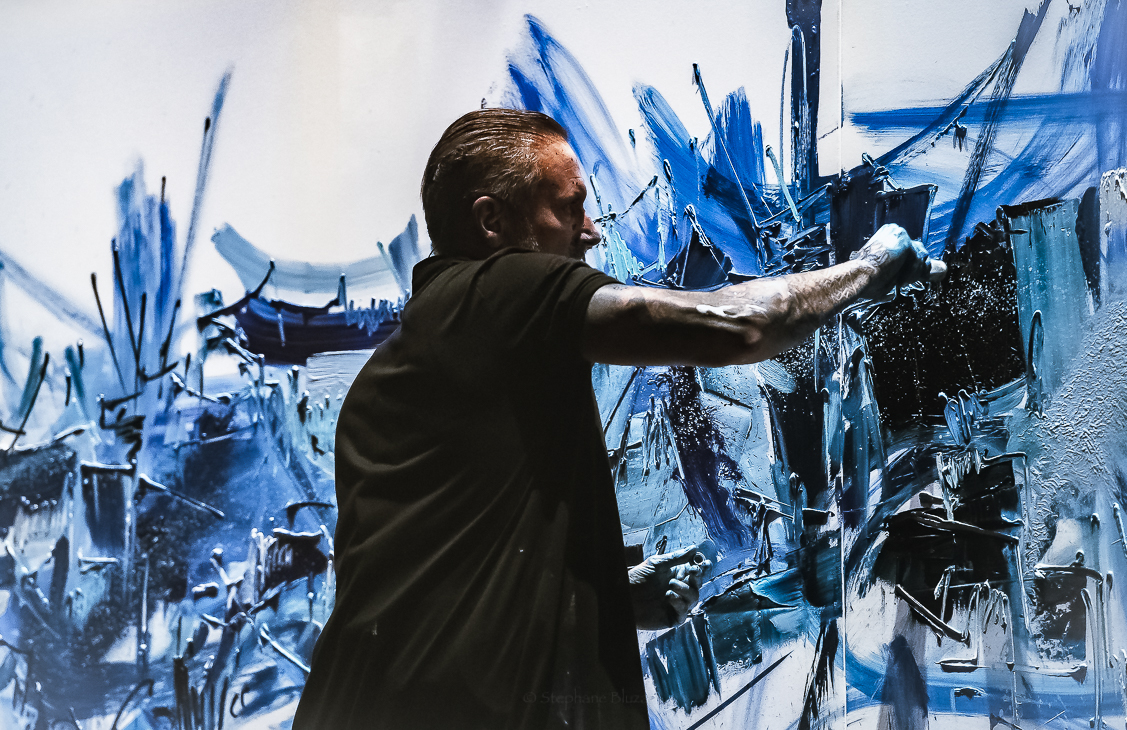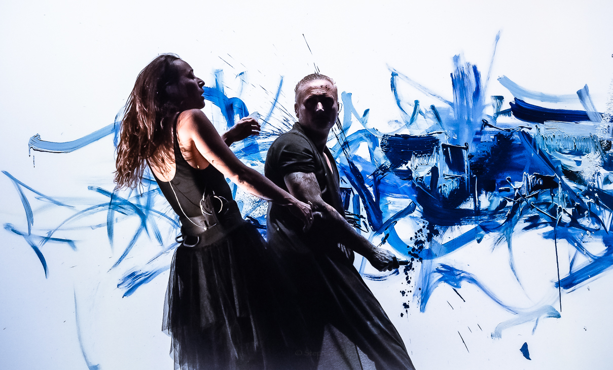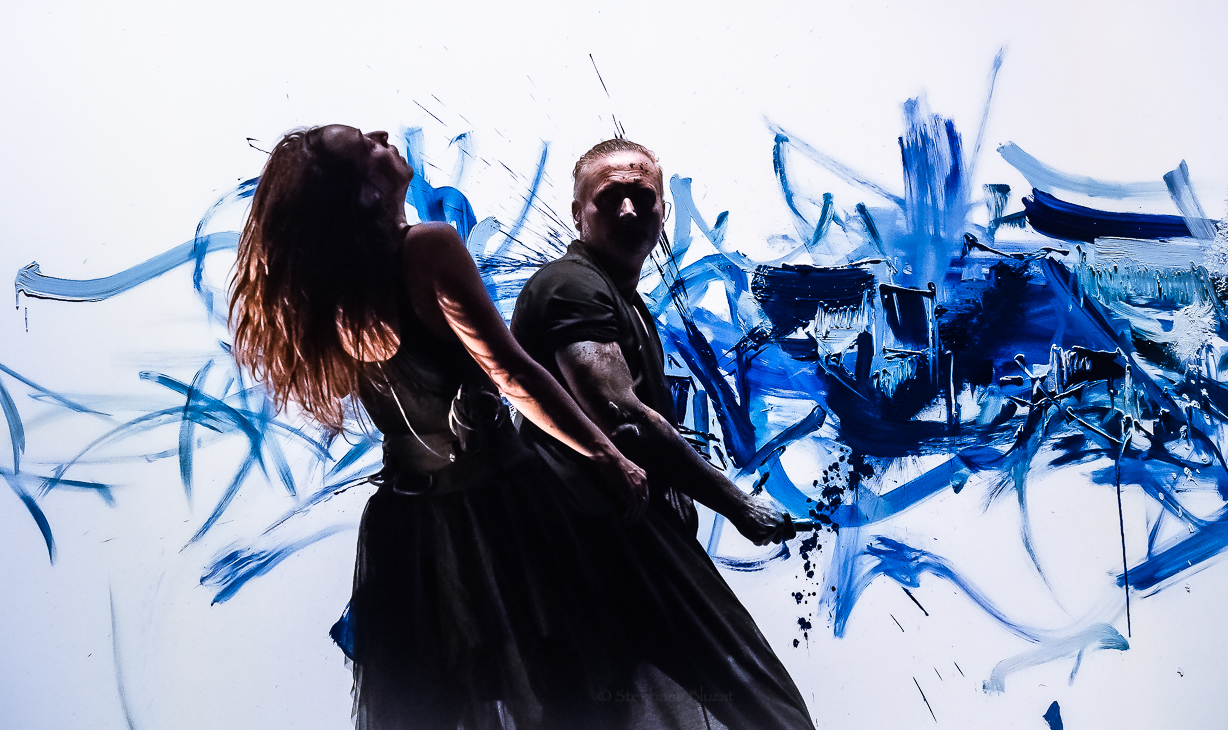 Lors de cette performance, l’artiste Karls, accompagné de Cybille Soulier (danseuse chorégraphiée en temps réel ) et de Sébastien Berteau (musicien composant en direct) a réalisé une toile de 8 x 2 mètres : « LA PROMESSE DU BLEU ».