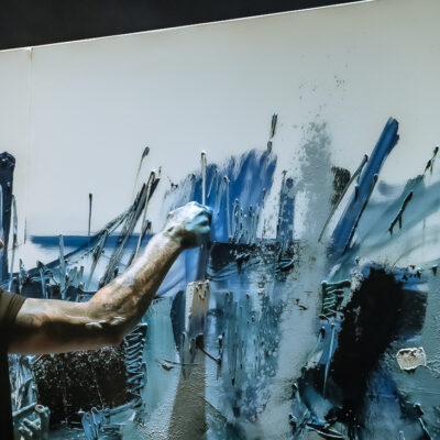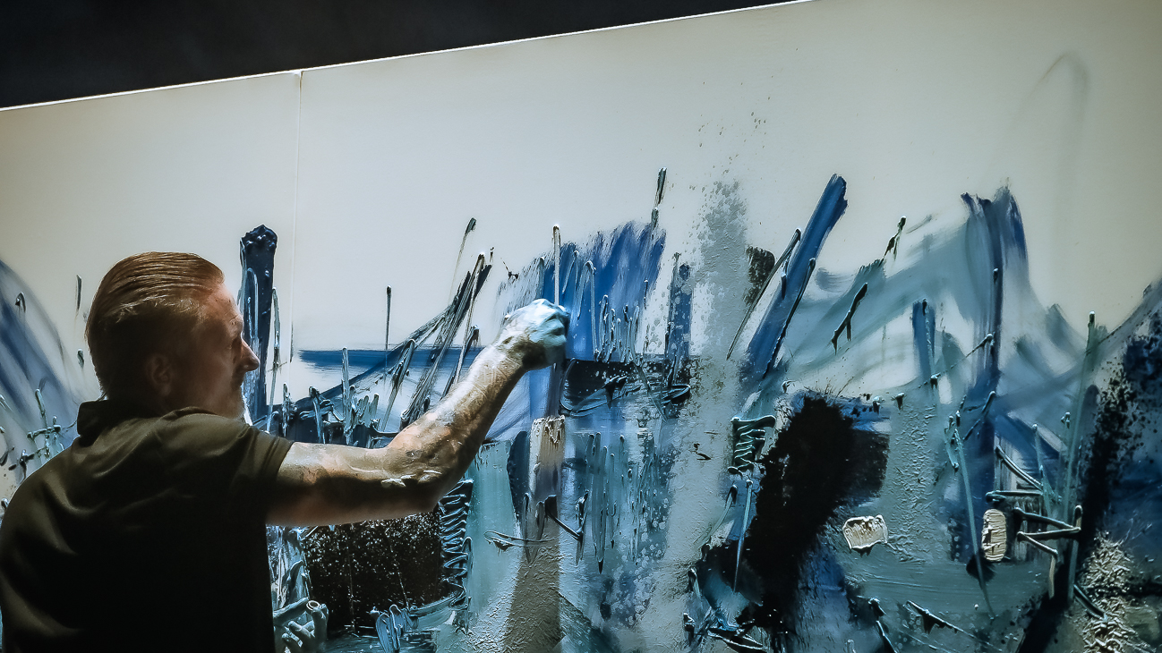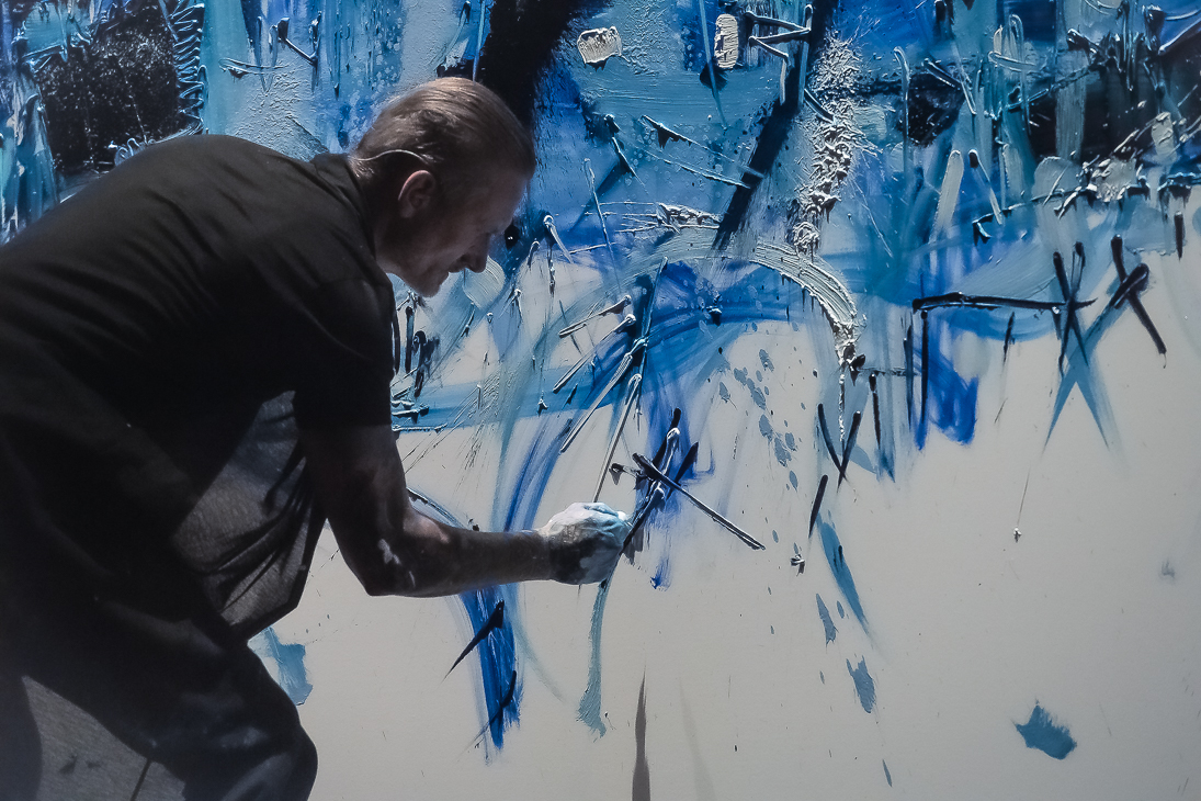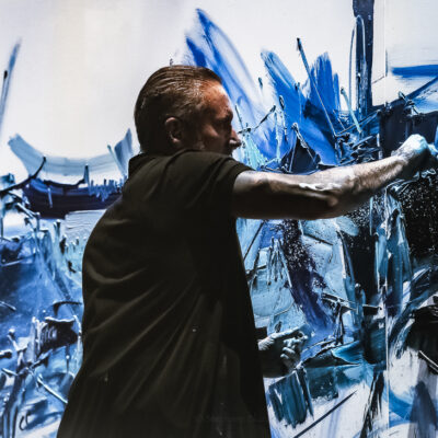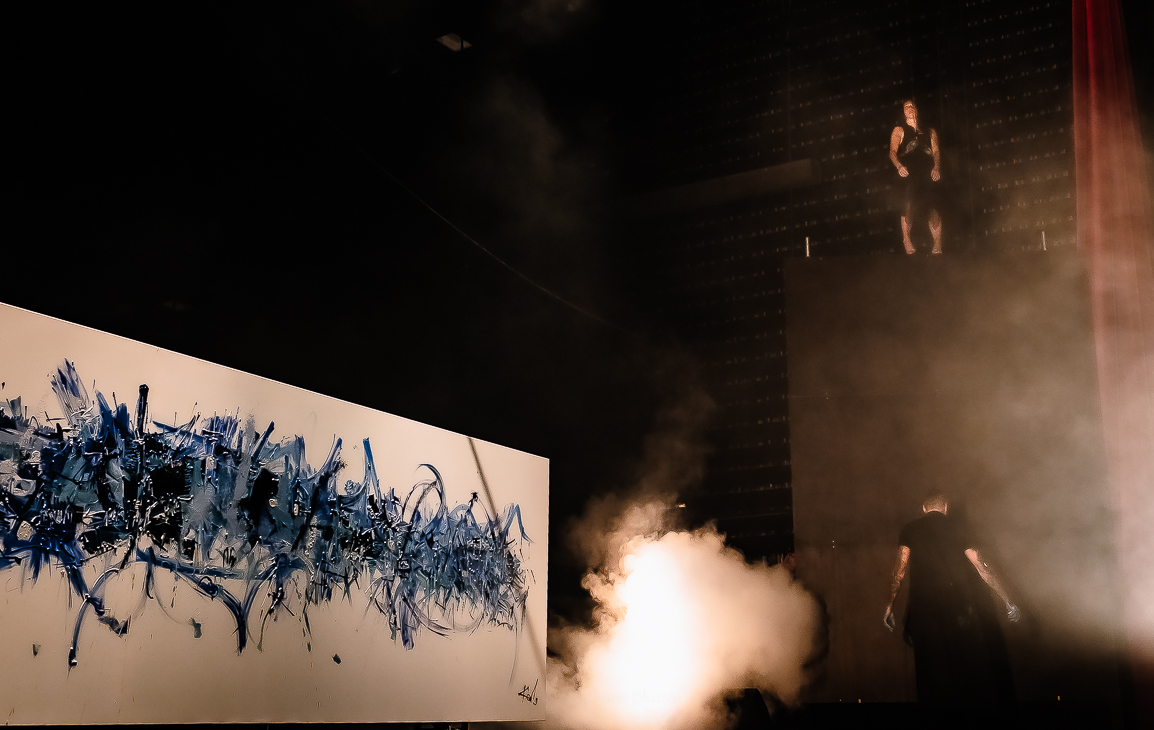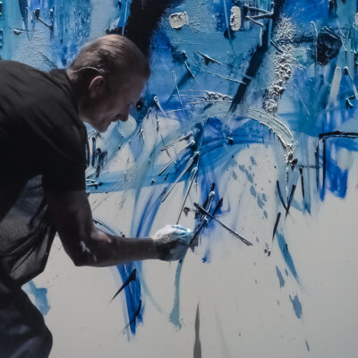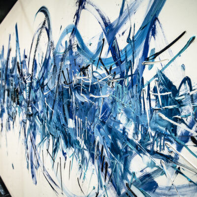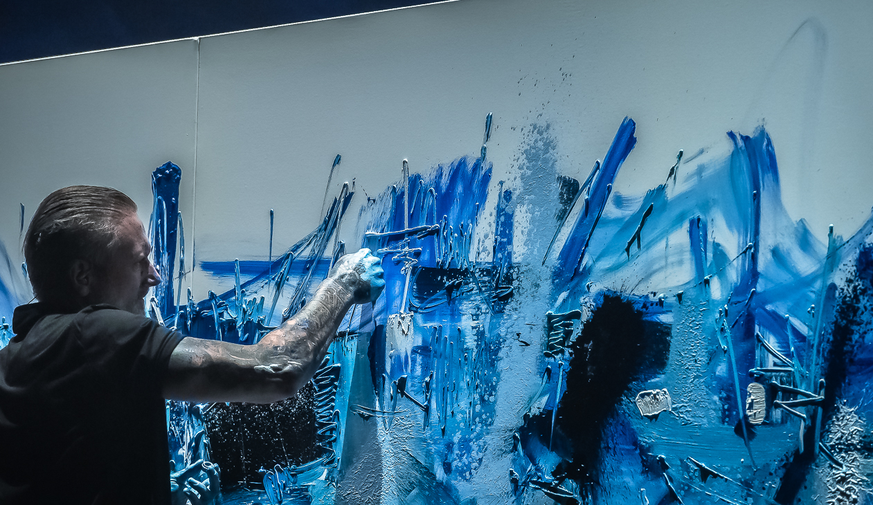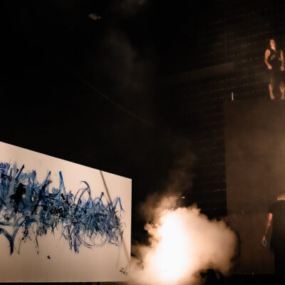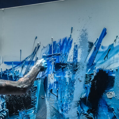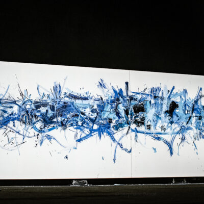Lors de cette performance, l’artiste Karls, accompagné de Cybille Soulier (danseuse chorégraphiée en temps réel ) et de Sébastien Berteau (musicien composant en direct) a réalisé une toile de 8 x 2 mètres : « LA PROMESSE DU BLEU ».