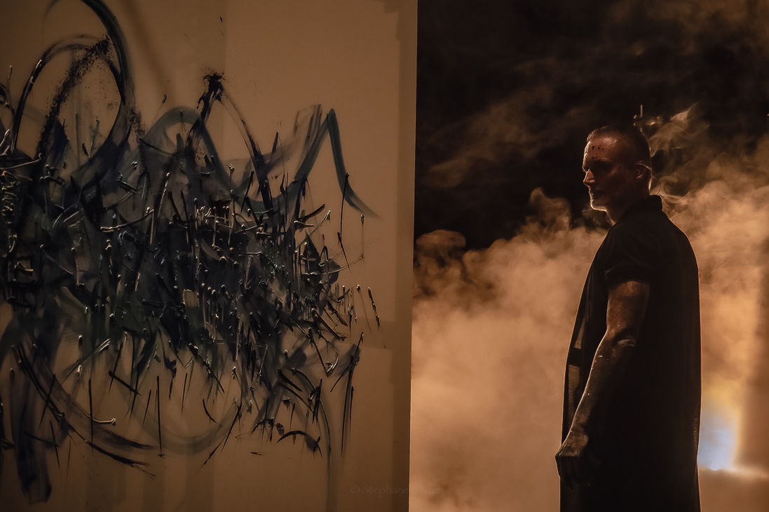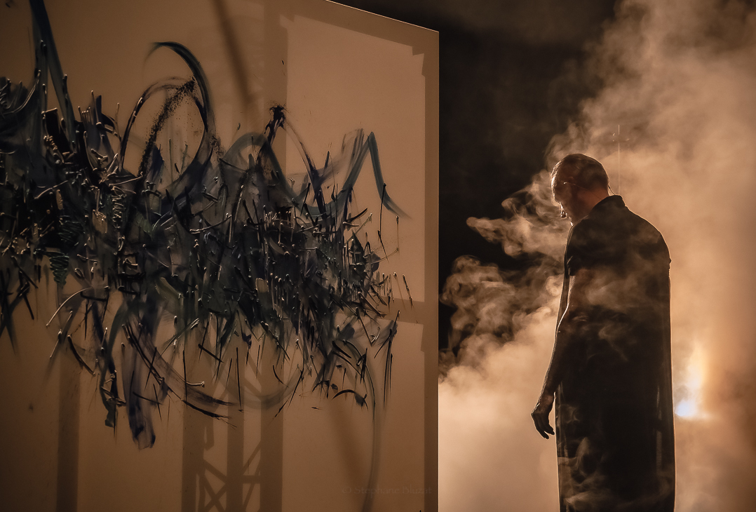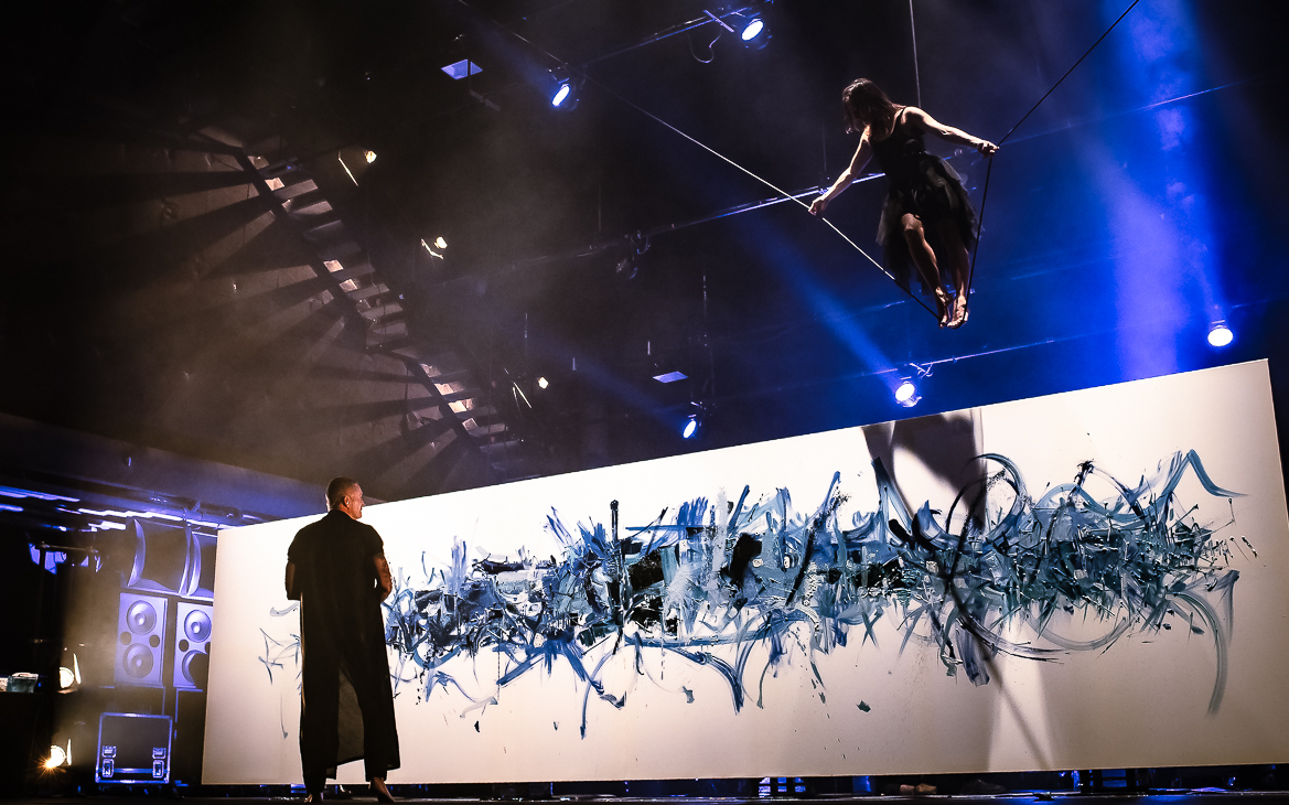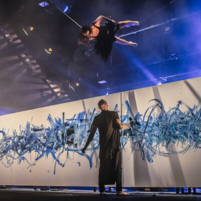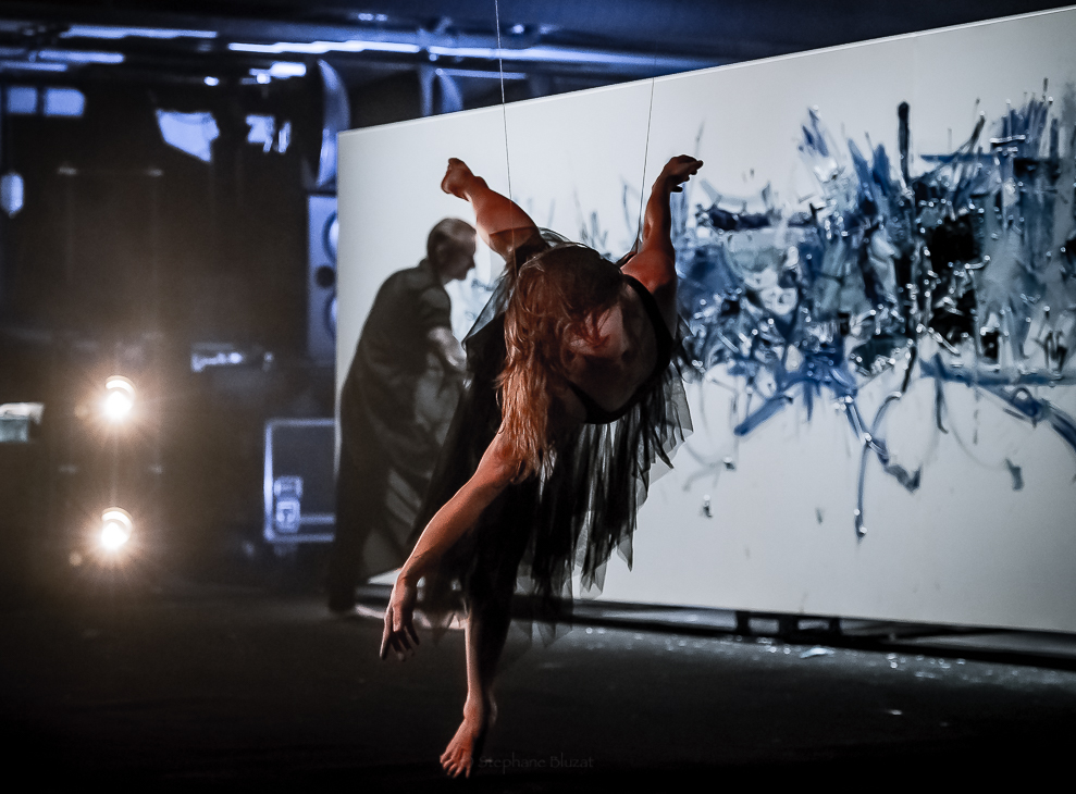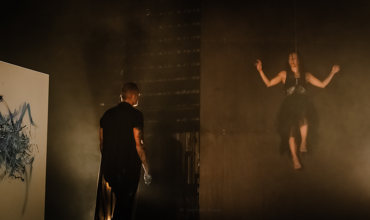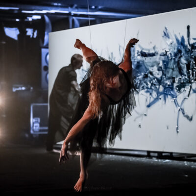 S’inspirant du mythe de Prométhée, Karls pose une réflexion sur notre condition humaine, où l’art apparaît comme une voie pour transcender la solitude et trouver du sens à notre monde. Cybille Soulier, danseuse verticale insuffle une légèreté aérienne qui défie la pesanteur. Son corps en suspension ou en dialogue avec le sol devient un vecteur d’émotions brutes, un langage corporel qui prolonge la peinture, la complète, l’interroge.