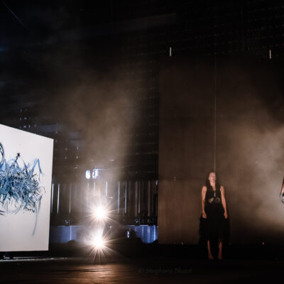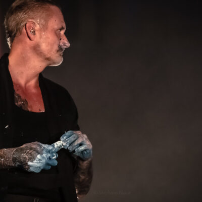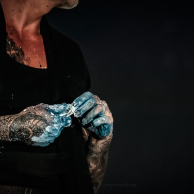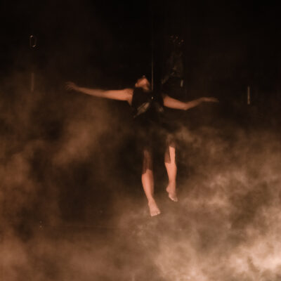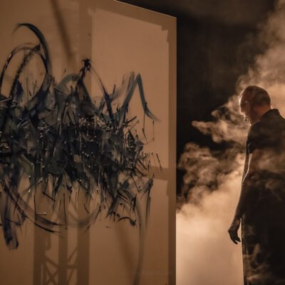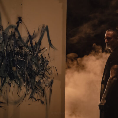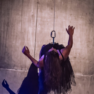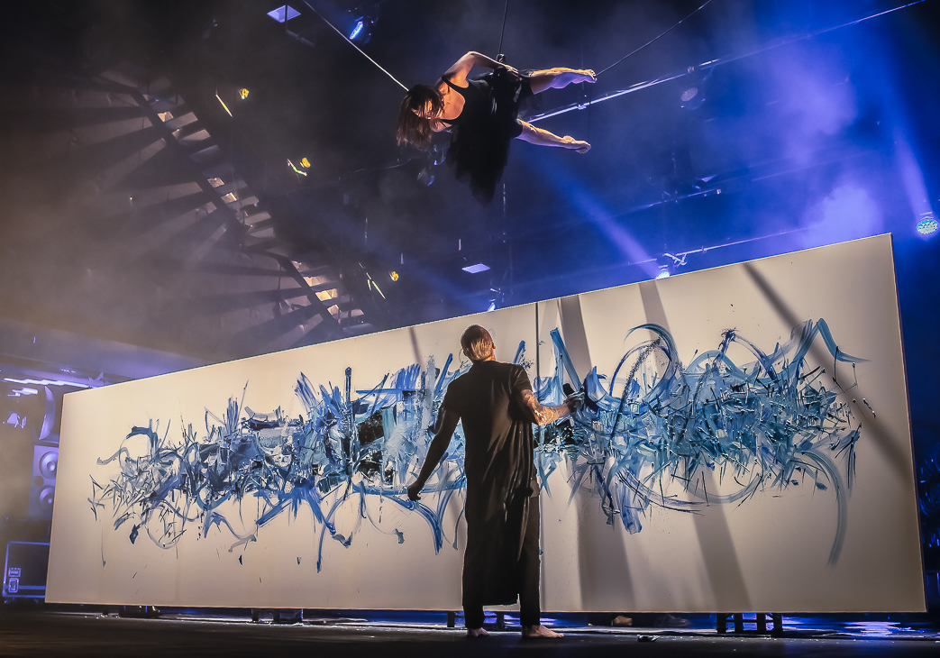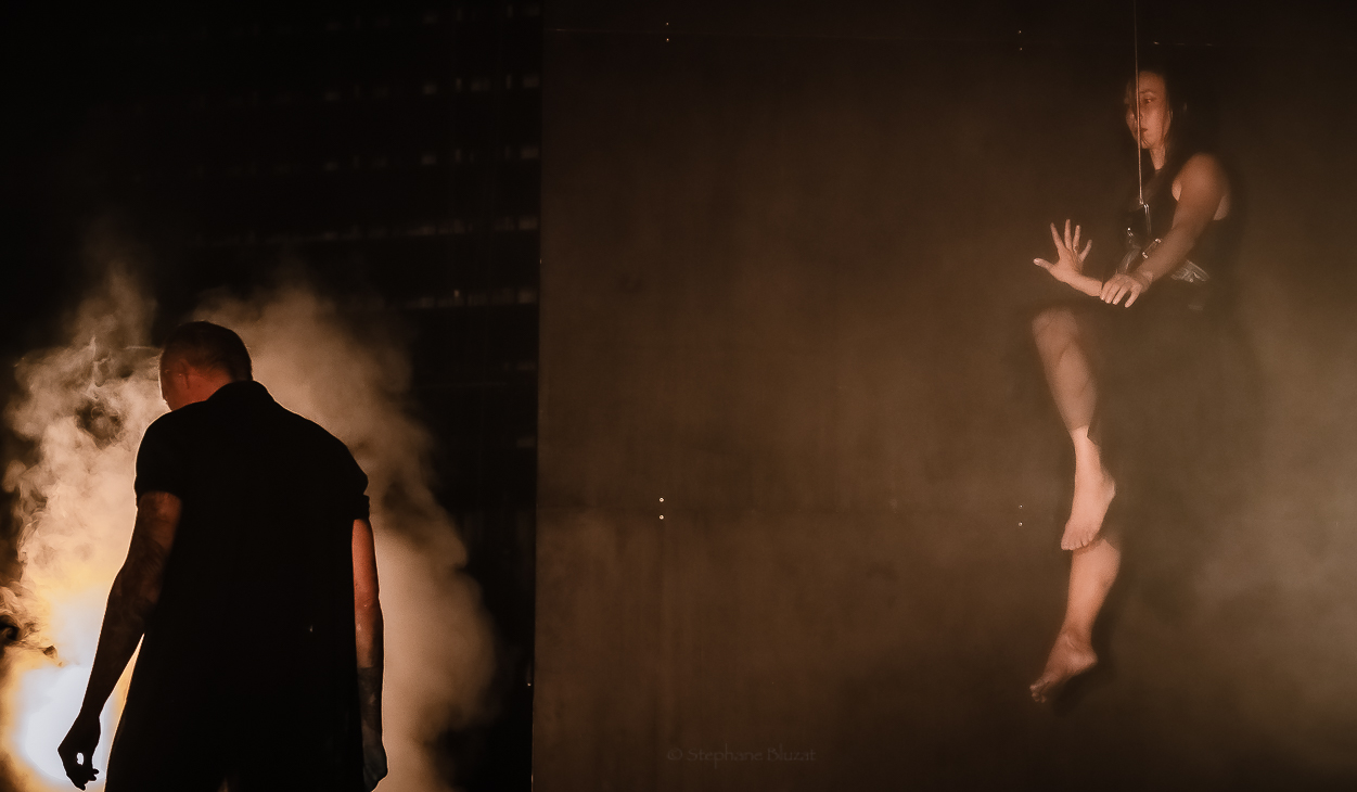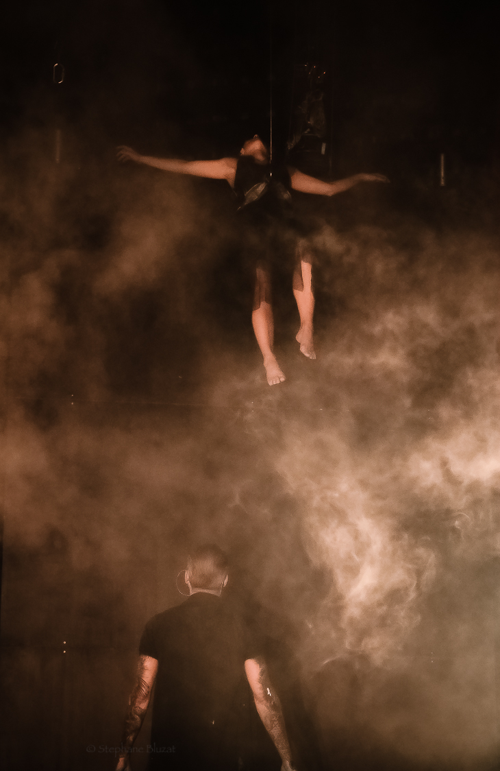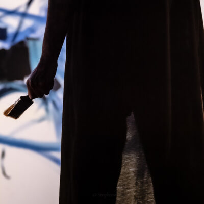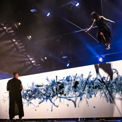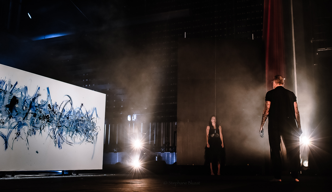 S’inspirant du mythe de Prométhée, Karls pose une réflexion sur notre condition humaine, où l’art apparaît comme une voie pour transcender la solitude et trouver du sens à notre monde. Cybille Soulier, danseuse verticale insuffle une légèreté aérienne qui défie la pesanteur. Son corps en suspension ou en dialogue avec le sol devient un vecteur d’émotions brutes, un langage corporel qui prolonge la peinture, la complète, l’interroge.